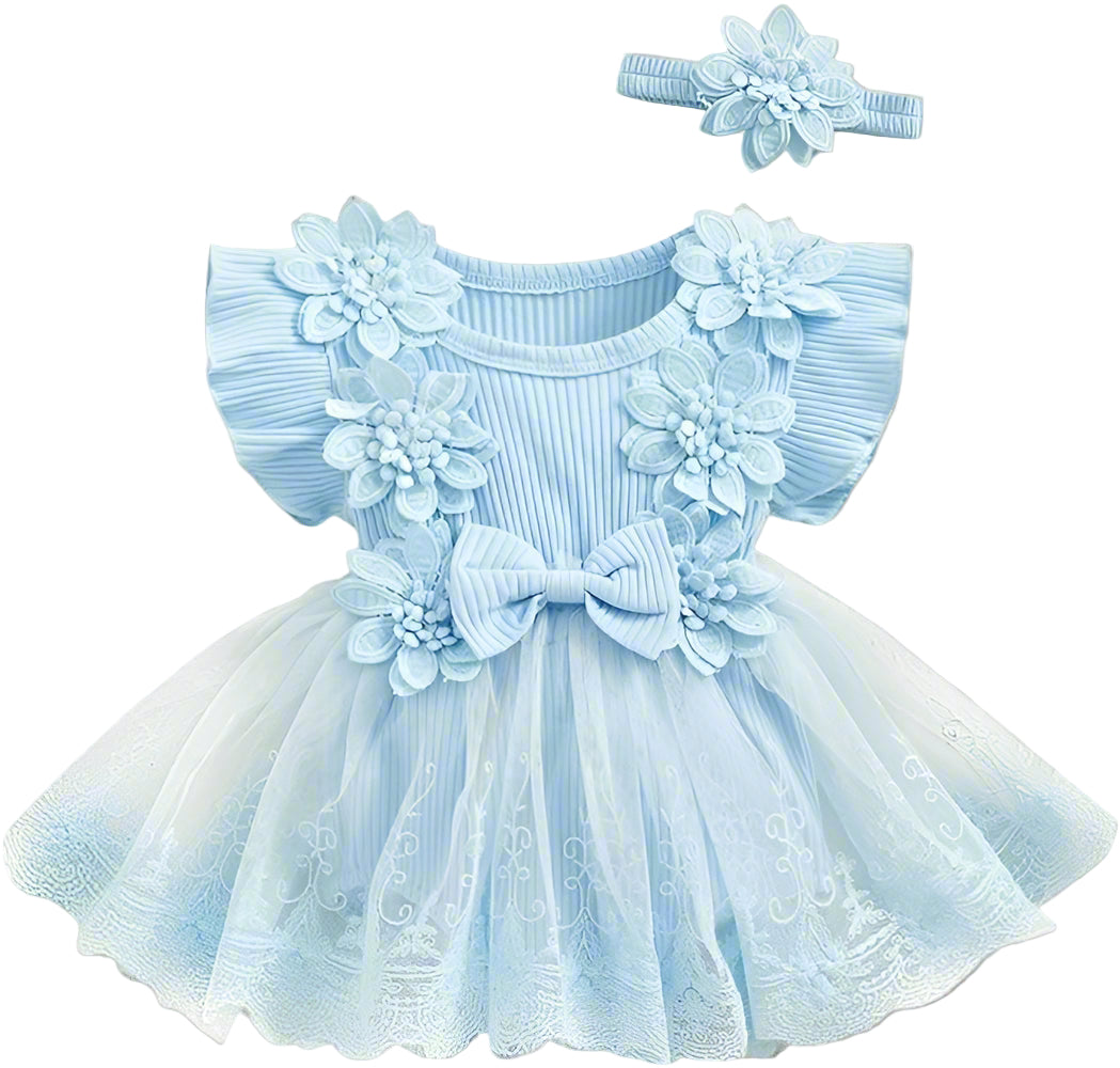 Fancy dress, light blue with applique flowers and bow, cap sleeves. Flowered headband